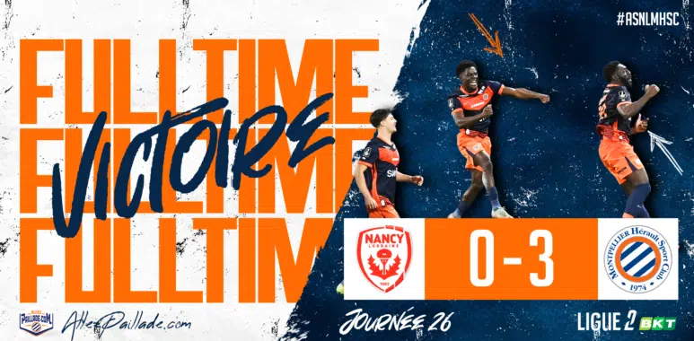 Montpellier a signé une large victoire (0-3) ce soir sur la pelouse de Nancy, un succès précieux qui permet aux Pailladins de rester dans la course aux places de barrage pour l’accession à la Ligue 1. Dans un stade à huis clos, conséquence des incidents survenus lors du match face à Grenoble, les hommes de Zoumana Camara ont livré une prestation globalement sérieuse et maîtrisée face à un adversaire, il faut le dire, assez faible.