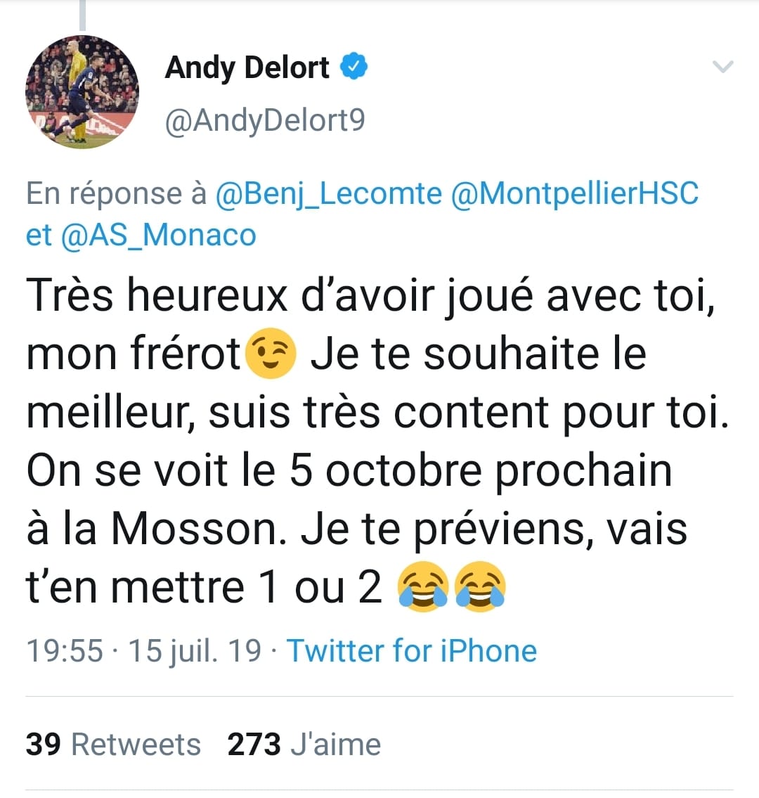 Les supporters Pailladins n’ont pas manqué de le souligner sur Twitter quelques instants après la rencontre. Lors de l’annonce officielle du transfert de Benjamin Lecomte à l’AS Monaco, Andy Delort avait adressé un très sympathique message au portier sur le réseau social. Sympathique message qui malgré tout valait également d’avertissement pour la rencontre de samedi soir: “Je te préviens, vais t’en mettre 1 ou 2”.