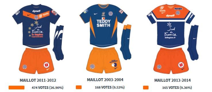 Pour les autres maillots, les votes sont extrêmement partagés. Ça se joue à quelques voix. C’est le Teddy Smith à short orange de 2003-2004 qui termine second, l’année de la descente en Ligue 2. Avec 9.53% des votes. Sur le podium aussi, le Sud de France de 2013-2014 avec 9.31%.