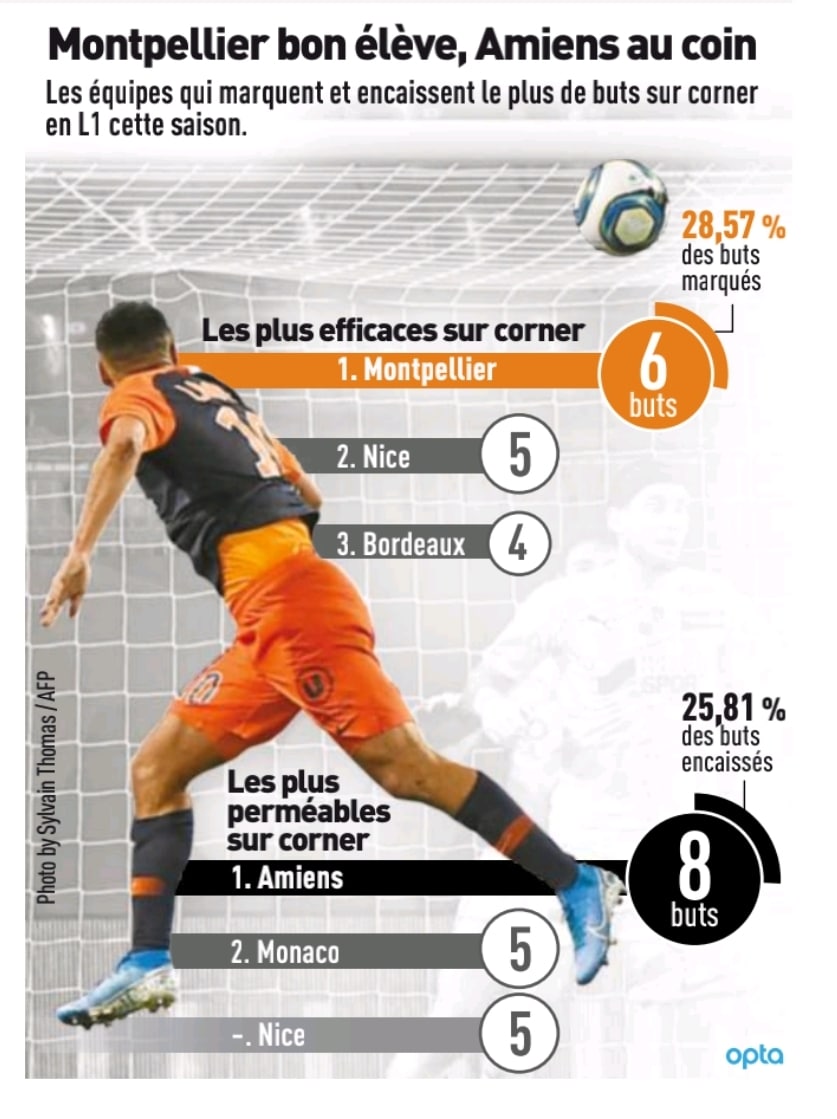 C’est une petite infographie L’Equipe qui nous apprend la statistique ce matin. En Ligue 1, le MHSC est le club le plus efficace sur corner avec 6 réalisations, soit quasiment 29% de nos buts inscrits cette saison. Nous devançons ainsi Nice avec 5 buts et Bordeaux avec 4 buts.