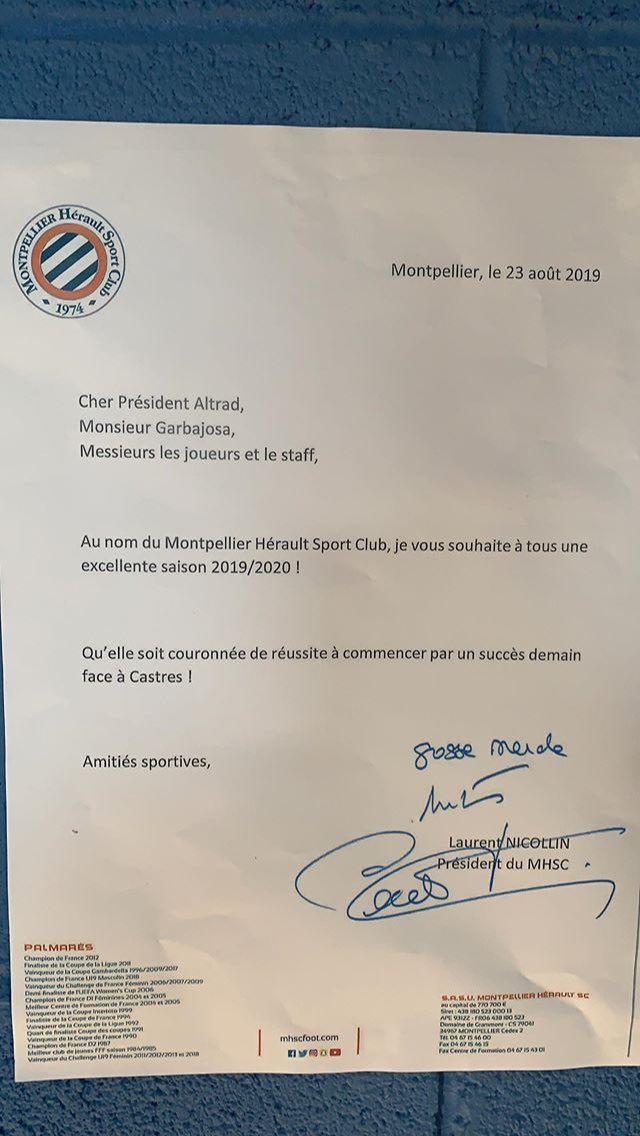 Le MHR débutait sa saison de Top 14 hier face à Castres (défaite 26 à 25) et Mohed Altrad, la veille, avait eu l’agréable surprise de recevoir un courrier signé, “grosse merde”, de Laurent Nicollin lui souhaitant ainsi le meilleur pour la saison à venir. Un président à la mentalité exemplaire.