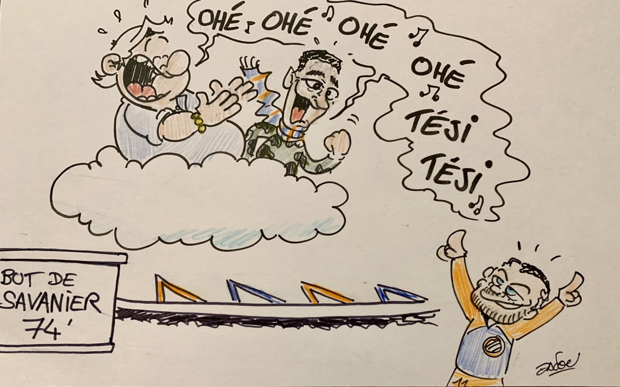 Le but de Téji Savanier à la 74ème minute a forcément inspiré le dessinateur Dadou sur le moment. Un très bel hommage à Loulou, à Ronan et milieu de terrain du MHSC.