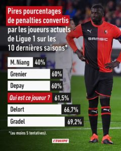 Ensuite, parce qu’elle rappelle de mauvais souvenirs. Avec 40% de penaltys transformés M’Baye Niang dispose du pire ratio de Ligue 1 dans ce domaine. Et lorsqu’on associe M’Baye Niang, penalty et échec, comment ne pas penser au manqué lors de AS Cannes – MHSC en Coupe de France ?