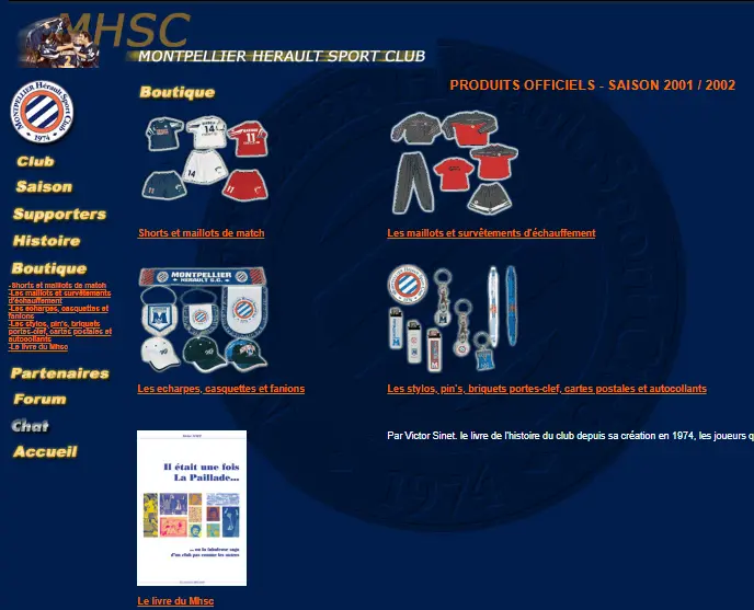 Le premier aperçu du site disponible date de janvier 2000. À l’époque, l’abonnement coûte 500 francs, une année de magazine MHSC 180 et si l’on souhaite se rendre à la boutique du club, c’est au 7 place St-Côme qu’il faut se rendre. Sinon, on peut toujours se procurer le maillot via un catalogue de vente par correspondance pour la modique somme de 349 francs. Tout un programme.