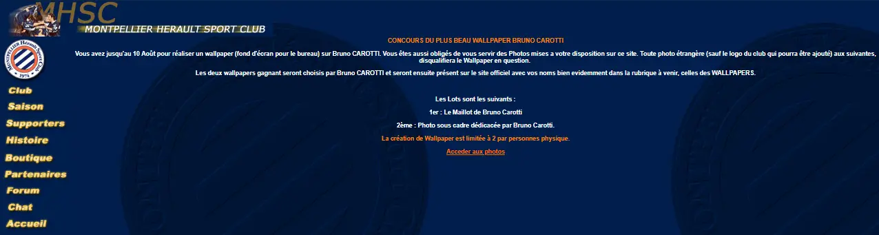 En 2001, Montpellier affronte le Real Madrid où un certain Zinedine Zidane vient juste d’être transféré, hasard ou pas, le site change aussi à cette époque. La page web se développe alors avec des rubriques qui auraient difficilement leur place dans un site de club moderne. On retrouve ainsi un onglet chat, forum ou même supporteurs avec les contacts de la Butte Paillade et des sites amateurs de fan. Avec le passage à l’Euro, un maillot se monnaye désormais 53€ et un abonnement vaut 76€ en Étang de Thau et 92€ en Gévaudan. Côté divertissement, la page organise une grande consultation pour connaître l’équipe type des 25 ans du MHSC. Au final, 40 noms seront retenus avec un 11 composé de Baills, Milla, Ziober ou encore Laurent Blanc. Autre concours, plus insolite cette fois, l’élection du plus beau fond d’écran en hommage à Bruno Carotti avec à gagner un maillot du joueur. À quand un remake avec Delort ?