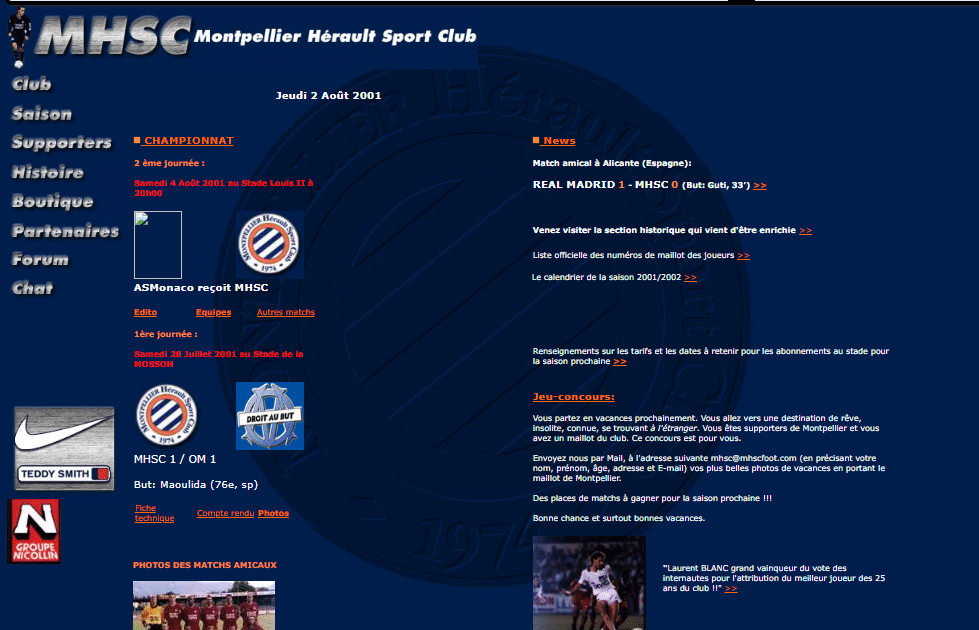 En 2001, Montpellier affronte le Real Madrid où un certain Zinedine Zidane vient juste d’être transféré, hasard ou pas, le site change aussi à cette époque. La page web se développe alors avec des rubriques qui auraient difficilement leur place dans un site de club moderne. On retrouve ainsi un onglet chat, forum ou même supporteurs avec les contacts de la Butte Paillade et des sites amateurs de fan. Avec le passage à l’Euro, un maillot se monnaye désormais 53€ et un abonnement vaut 76€ en Étang de Thau et 92€ en Gévaudan. Côté divertissement, la page organise une grande consultation pour connaître l’équipe type des 25 ans du MHSC. Au final, 40 noms seront retenus avec un 11 composé de Baills, Milla, Ziober ou encore Laurent Blanc. Autre concours, plus insolite cette fois, l’élection du plus beau fond d’écran en hommage à Bruno Carotti avec à gagner un maillot du joueur. À quand un remake avec Delort ?