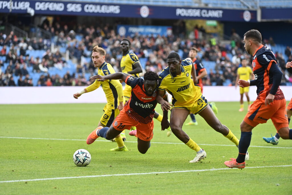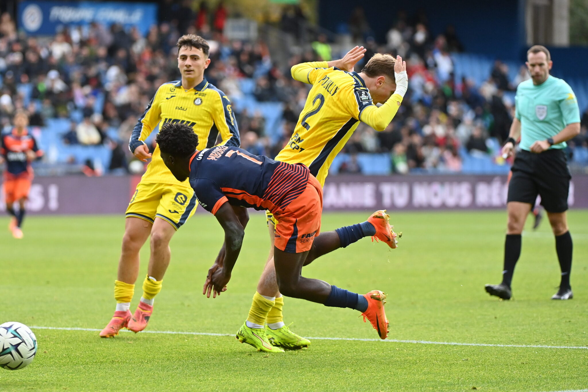 Ce sont au minimum trois actions qui auraient pu valoir un penalty : une main paloise décollée du corps, une intervention brutale sur Alexandre Mendy et Nathanaël Mbuku fauché en plein dribble, comme visible ci-dessus. En toute fin de match, c’est même Nicolas Pays qui a failli hériter d’un carton jaune pour une faute subie aux abords de la surface paloise. Lunaire.