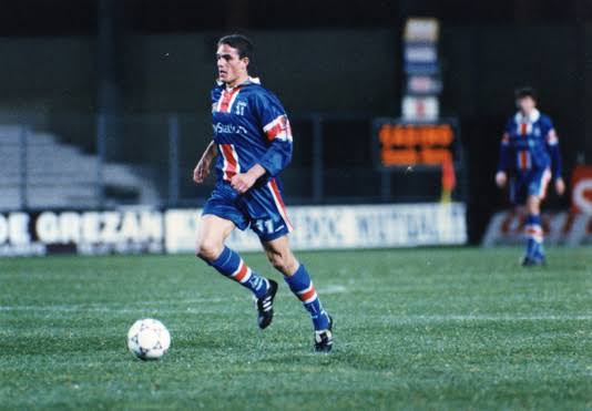 Mais son époque est surtout marquée par le mythique Maillot Erima bleu roy barré d’une bande orange façon Hechter du PSG, en mode avant-goût du destin.