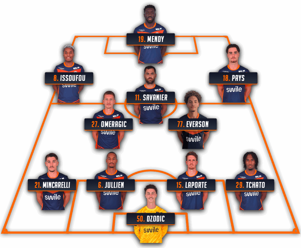 Si un changement tactique et un retour à une défense à cinq n’est pas à exclure, on a décidé de maintenir le schéma préférentiel de Zoumana Camara pour ériger cette composition probable où Viktor Džodić prend place dans les cages en l’absence de Mathieu Michel. Devant lui, les latéraux seront les mêmes, concurrence oblige, avec Enzo Tchato à droite et Lucas Mincarelli à gauche. Dans l’axe, retour de Christopher Jullien, aux côtés de Julien Laporte.