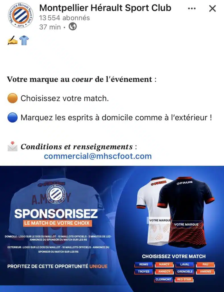 Selon nos informations, comptez tout de même 5 000€ à l’extérieur et 7 000€ à domicile pour afficher votre marque sur la liquette héraultaise, un prix incluant aussi une publicité sur les écrans du bord pelouse. Des tarifs similaires à ceux pratiqué par Grenoble qui s’était retrouvé dans la même situation en 2024 et qui avait affiché le montant de 5000€ par match pour être sponsor principal, un meilleur emplacement donc.