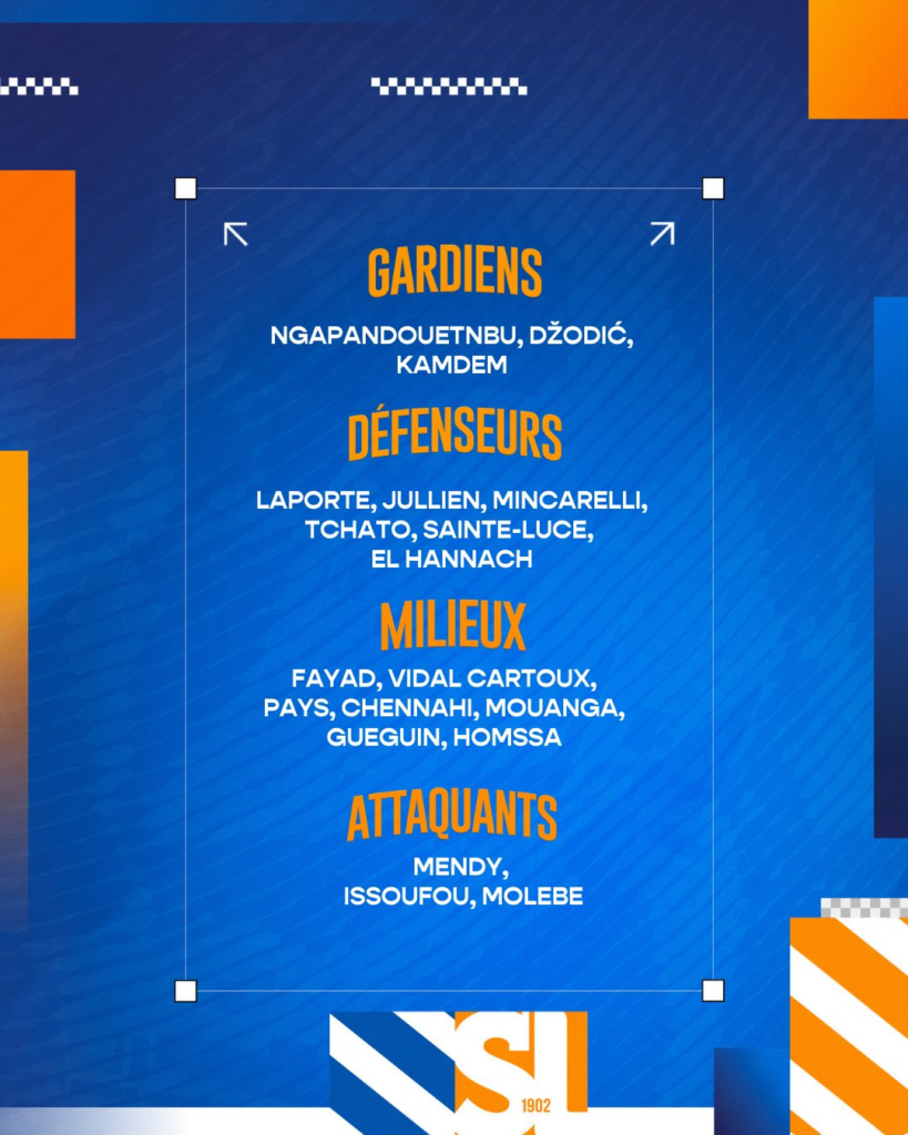 Absents : Mbuku, Everson Jr (suspendus), Savanier, Sishuba (blessés), Megnan-Pavé, Ndollo, I. Mohamed, Ebener, Djemba, Zeghadi, Vidal-Cartoux, El Mahboub, Thiland-Hérard, Michel (g)