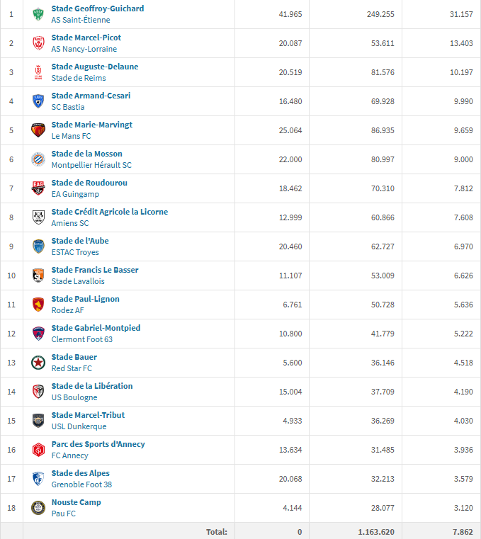 Tout en bas, Pau, Dunkerque et le Red Star souffrent de leur petit stade et parviennent à le remplir en grande partie. Au contraire d’Annecy, Grenoble, Boulogne et Clermont qui ne parviennent pas à remplir leur stade à moitié. Le leader du championnat, l’ESTAC est lui 9e de ce classement avec 6.970 fans de moyenne malgré les 20.460 places du Stade de l’Aube.