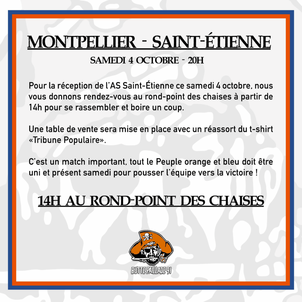 Acteur majeur de la rencontre du week-end face à Laval, la Butte Paillade maintient son engagement auprès du MHSC plus que jamais. Le groupe Ultras Pailladin appelle au rassemblement ce samedi dès 14h au rond-point des chaises en prévision de la rencontre face à l’AS Saint-Etienne. L’occasion de passer un moment entre supporters héraultais avant le match de prestige de cette 9ème journée de championnat de Ligue 2 et de boire un coup. La BP91 précise qu’une table de vente sera également mise en place pour assurer la commercialisation des derniers tee-shirts “Tribune Populaire”.
