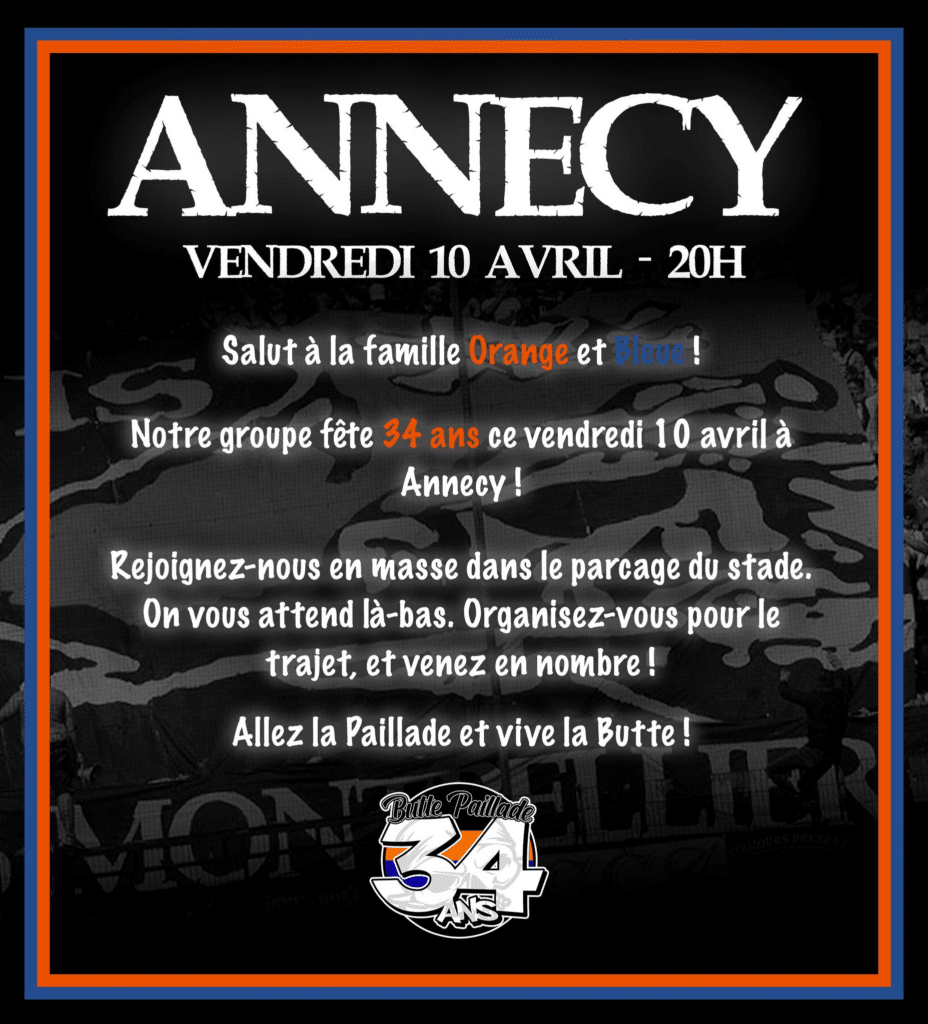 Tous les éléments semblent réunis, pour ceux qui en auront l’opportunité, de rallier Annecy, demain dans le cadre de cette nouvelle journée de championnat. D’abord sportivement car même si les données ne nous sont pas favorables, c’est dans ces moments que les plus belles pages du ballon rond s’écrivent. Et puis à tête reposée, la rencontre contre l’ESTAC méritait un autre sort. L’espoir peut ainsi perdurer… Mais se déplacer dans les Alpes, c’est surtout l’occasion de fêter les 34 ans de la Butte Paillade et de vivre un moment qui restera, d’une manière ou d’autre, dans l’esprit de tout le monde.